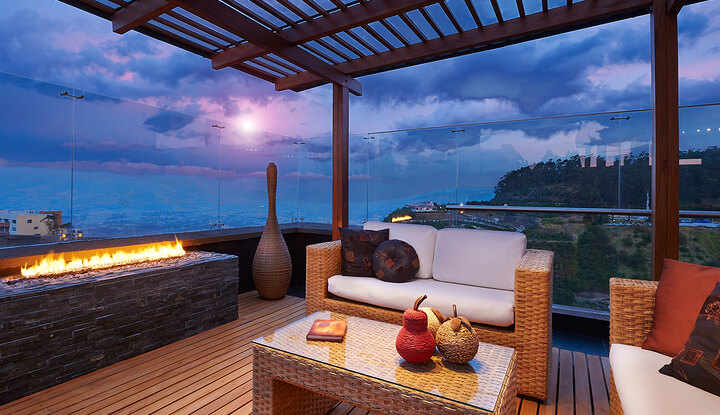 Description: Interior design: Beautiful modern terrace lounge with pergola at sunset